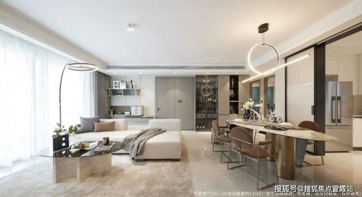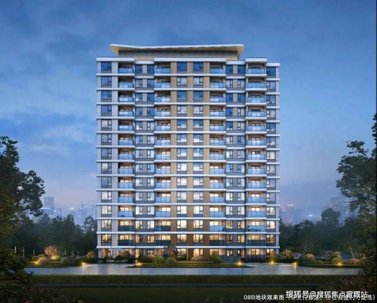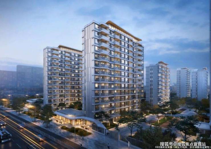 外立面层次感丰富。据悉,建筑立面融合内敛灰与青水蓝的极简,搭配香槟金,层次丰富的曲线和几何形式凸显建筑立面肌理的质感。