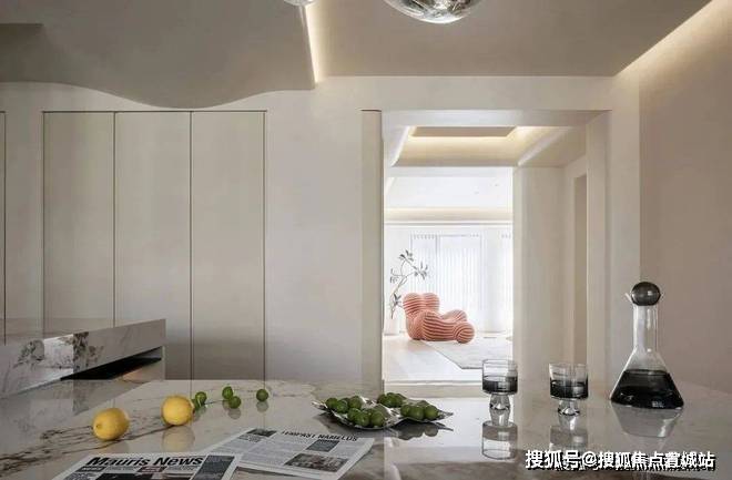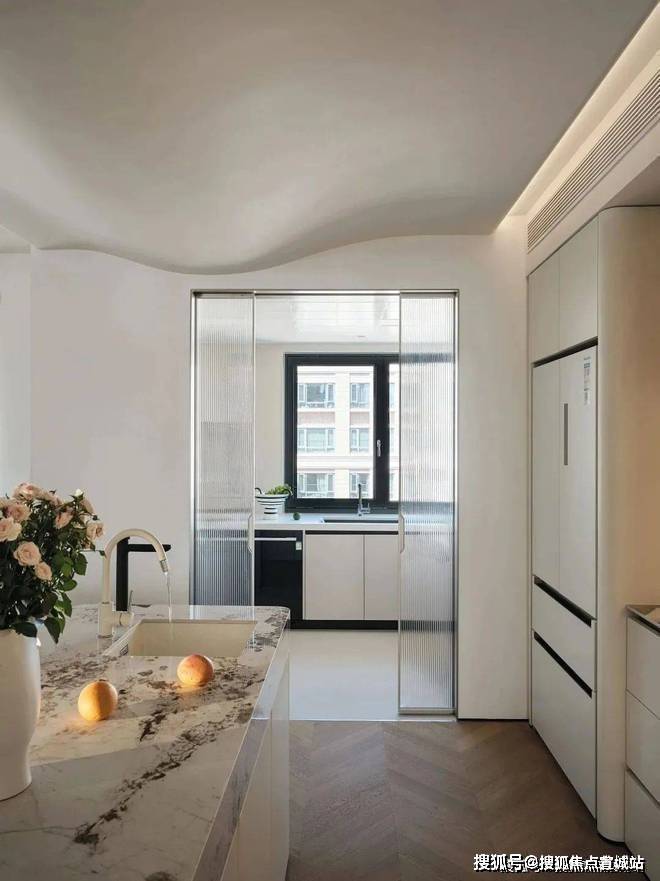 空间与光线的友谊沿着极简走向无尽.嵌入式厨电,使得布局更加开阔明了,将突兀二字尽数抹去.泼墨大理石台面由几抹亮色点缀,奢雅之中巧露活泼生动.