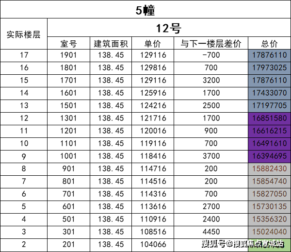东边套139㎡户型的定价逻辑则有所不同,各楼层之间存在更为明显的价格差异。