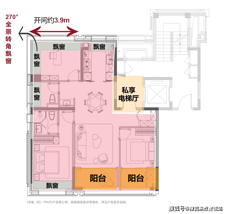 户型亮点:部分户型配置独立电梯厅入户,搭配多阳台与多飘窗设计,部分房型还设有270°全景转角窗,可优化采光与观景效果。