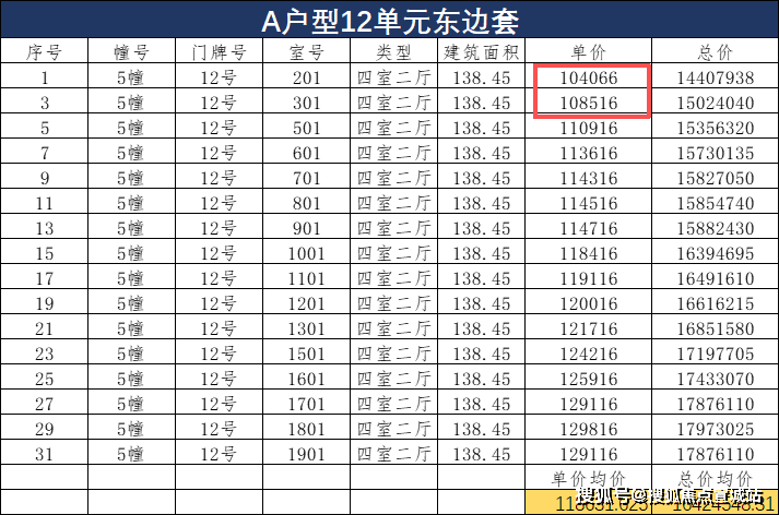 小高层119㎡户型中,单价最高的为12单元,主要原因在于这个单元与东边套139㎡户型拼接,得房率相对更高——在套内面积与13单元同户型相近的情况下,产权面积比13单元中间套小了近3㎡,因此单价略高。