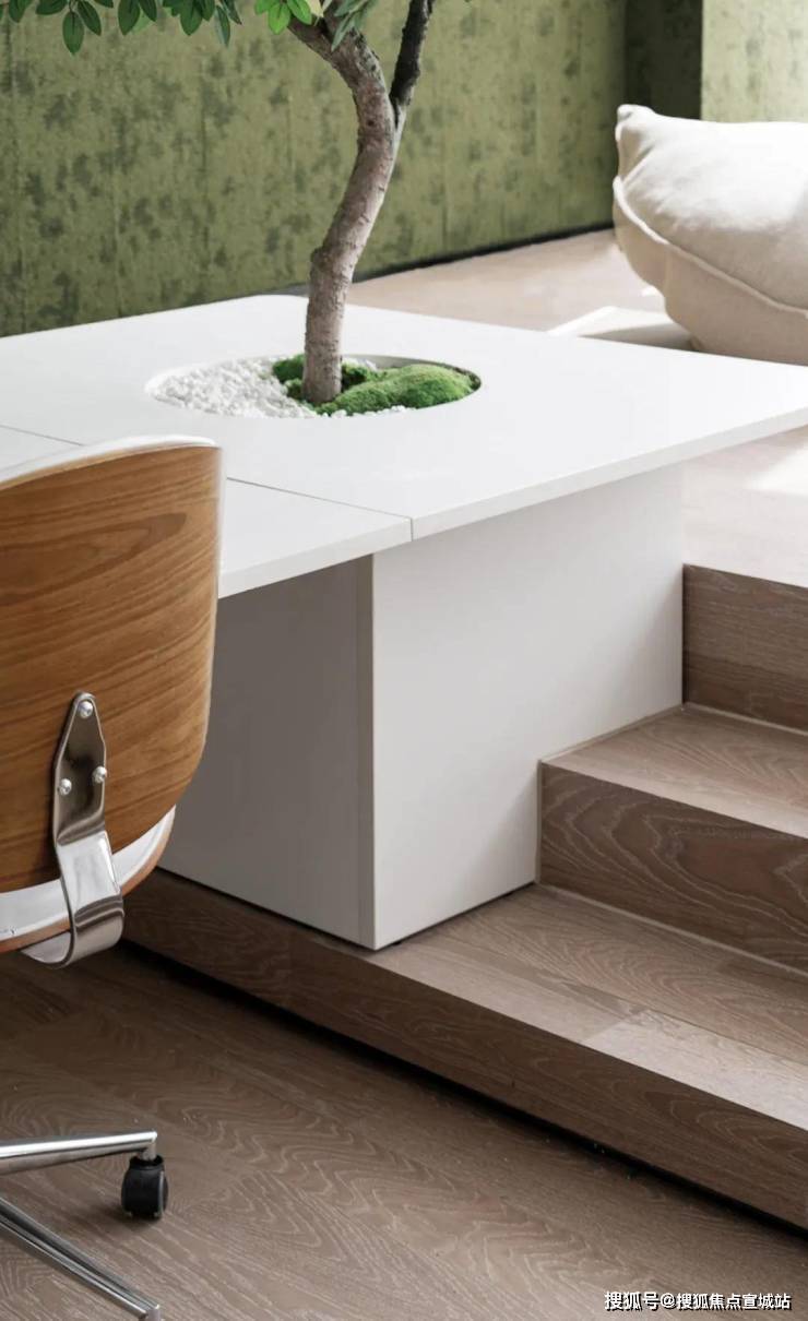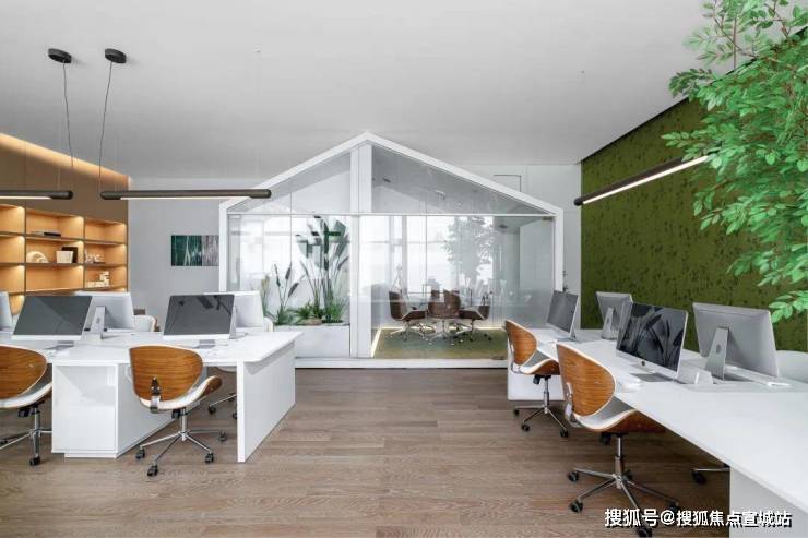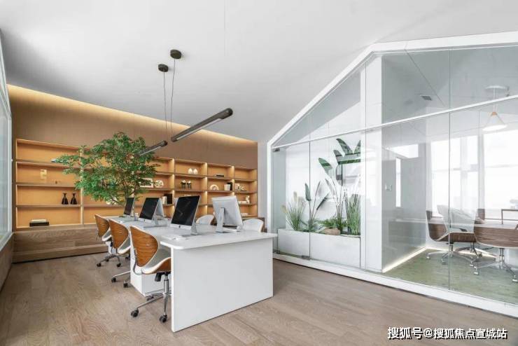 HWCD设计师将绿植元素作为主设计元素,在办公室内搭建起如植物温室般的框架结构作为洽谈室,让人心旷神怡,仿佛处于一方静谧森林之中。
