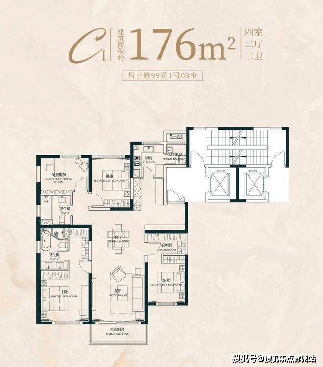 建面约176㎡4房2厅2卫户型: