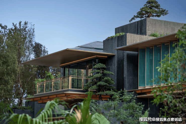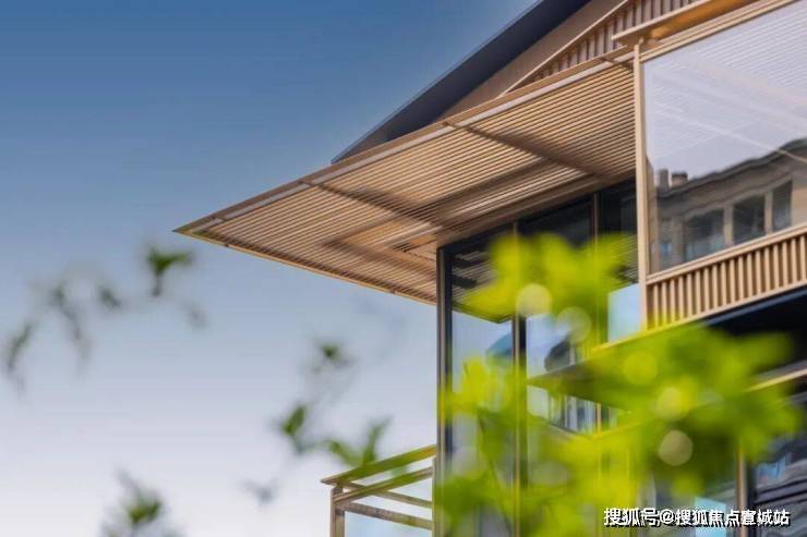 在立面打造上,樾青岚提炼飞檐、斗拱、引檐、直棂窗等宋代建筑细节,融揉现代审美工艺,重塑东方的当代表达;提取宋画中的线条感,通过局部铝线条的运用,融合巨幕灰蓝色玻璃,让建筑隐于自然,如画框一般,呈映天光云影。