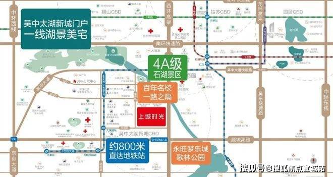 交通配套:以西环南延、吴中大道快速路为依托,交通便捷,在建的地铁 7 号线串联苏州各大区域,周边直线 2km 范围内共有 4 个地铁站,1km 内有 15 个公交站124。