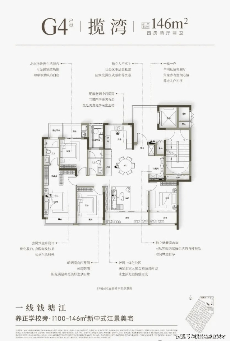 户型信息:主推户型为建面约100-146㎡的3-4居室,其中100㎡为3室2厅2卫,121㎡、146㎡为4室2厅2卫。高层部分户型为“类一梯一户”设计,部分楼层可看一线江景。