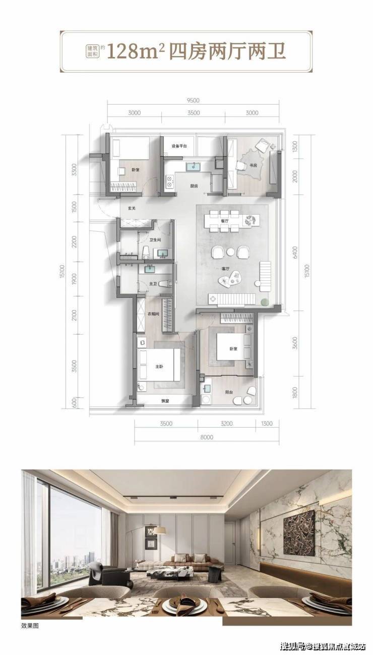 空间效能进化超90%得房率在空间效能维度,君潮润府通过面宽的增加,将主客厅面宽拓展至7.8米,配合封闭式景观阳台设计,使225㎡户型在得房率超90%的前提下实现五房五卫三套房的格局。每户的客餐厅及主卧的面宽都加大了300mm。