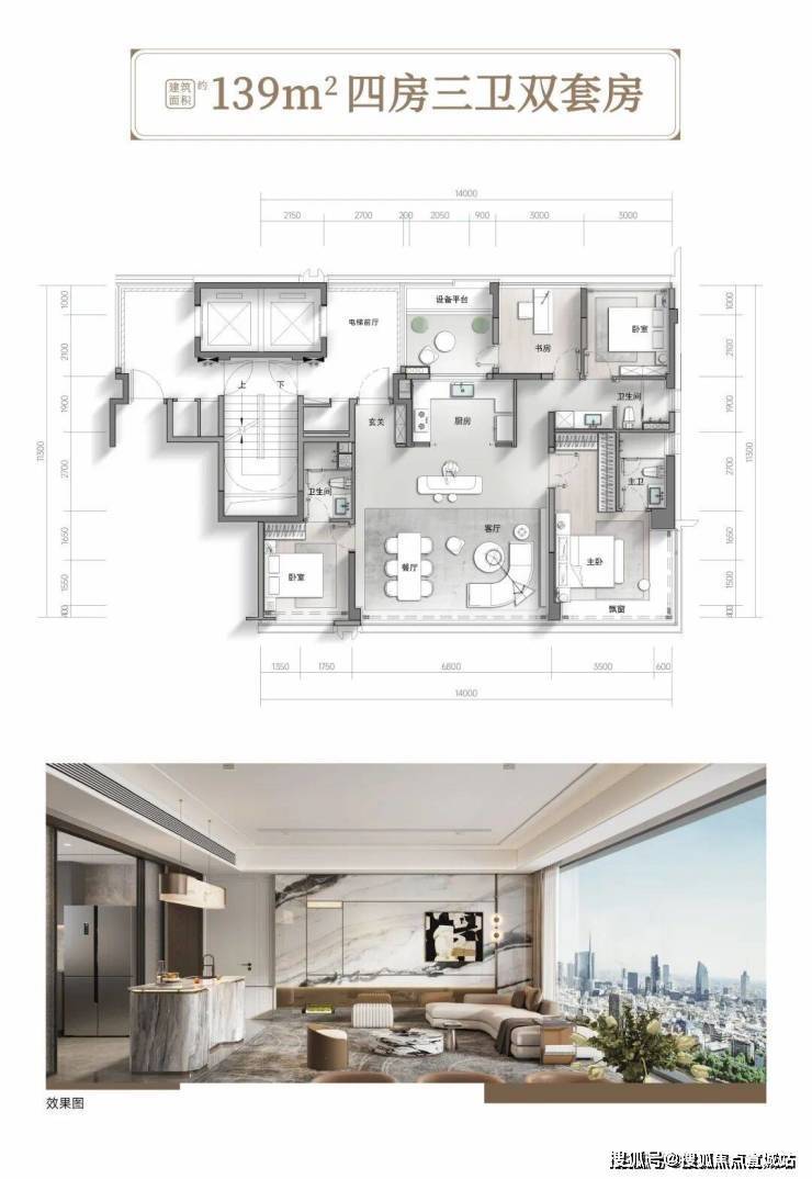 保亿君潮润府139㎡4房3卫户型做到四室三卫的同时室内实际空间使用率高达97%,南向面宽约14米,客厅6.8米南向面宽;连接北侧的书房、北阳台、私家电梯厅,可形成一个可以植入更多生活场景的大洄游动线空间