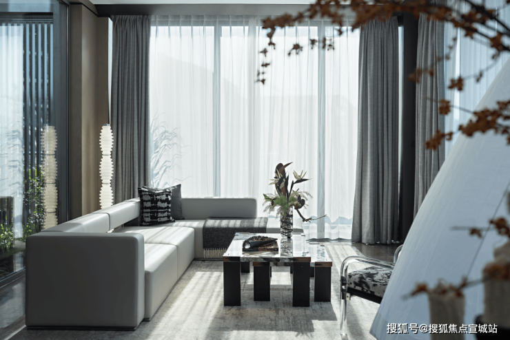 独立前院和礼仪玄关入户,一出电梯门,只见餐客厅和书房一字排开,面宽达约19.8米。一个环绕式超级露台,长度达约30米!设计糅合山居生活与当代设计风格,以静谧优雅的风格诠释国际现代奢华的诗性与意韵。