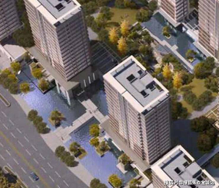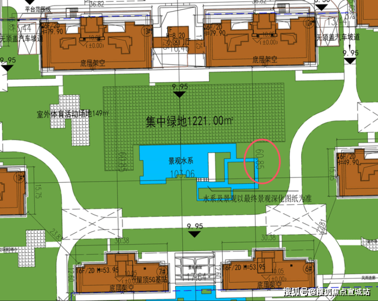 从设计图上看,这个小区地面布置了大量的景观水系。南面主入口的小区门厅外,就做了大面积的对称水景,穿过大门后,又是下沉庭院和景观水系,整体连贯铺陈,仿佛湖中小岛。