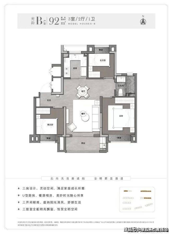 建面约92㎡3房,三开间朝南飞机户型,南向总开间约10.1米,南向主卧和次卧分布在客厅两侧,保证了私密性。