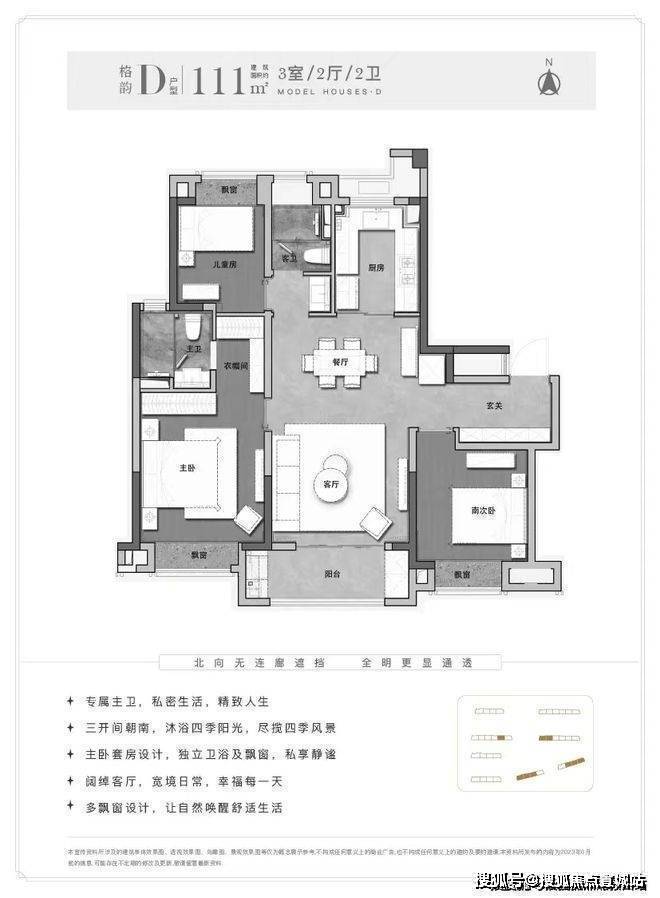 尊重隐私,人性卧室化布局:南向主卧和次卧分布在客厅两侧,保证了居者私密性;“主卧的空间尺度”决定着我们的生活。主卧是主人居住的私密空间,是整套住宅的核心。带飘窗主卧,景观视野好,明卧阳光清风也充分考量居住者的健康。