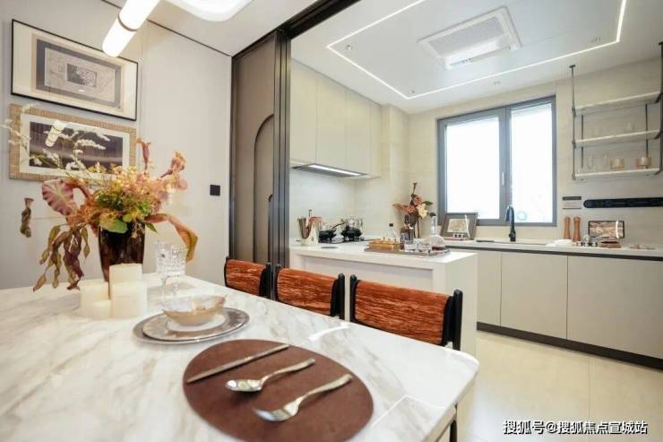 厨房配置中央空调,操作台面配置轨道插座,岛台台面安装升降插座,方便随时添置小家电,甚至插座上面还是一个无线充电面板。