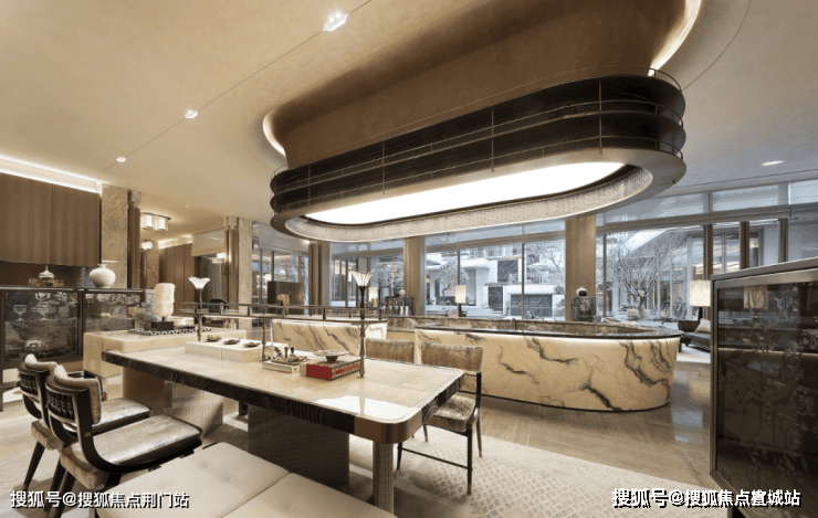进入大门之后的庭院,用11根约5。3米高的弧形柱子,环绕拉升起了一个巨大的藻井空间,吊顶大手笔用了透光云石,柱顶嵌入了奢石;正中央更是种下了一株百年古桂树,冠幅有约7。6米,树高有约7米,一眼望去仿佛撑满了整片藻井天幕。