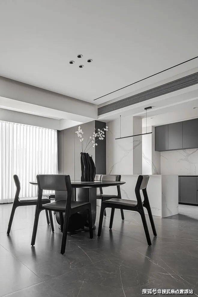 餐厨空间也采用同样的设计手法,增加内嵌式储物空间,让开放式厨房进一步宽敞,许多物品也有了摆放的空间。落地窗提高用餐愉悦感。