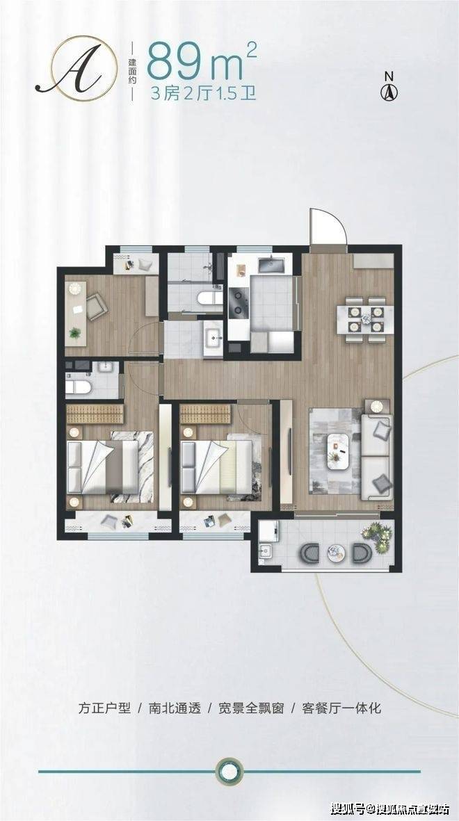 建面约89㎡3房,户型方正,三开间朝南。餐客厅一体,连通阳台,采光通风俱佳。全卧飘窗,主卧套房设计,提升了舒适度。1.5卫设计更加人性化,便于使用。