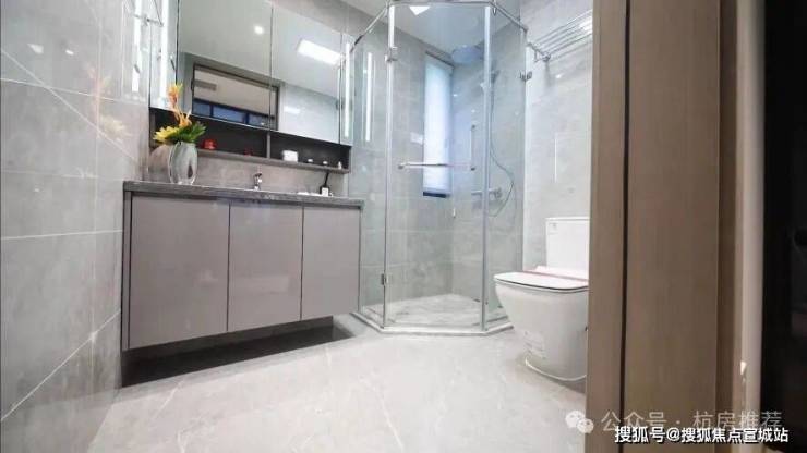 淋浴间地面部分采用了石材拉槽铺贴,墙面都是诺贝尔瓷砖,特别是每个卫生间都配有镜柜设计,镜柜里面还贴心地预留了内置插座,平时给电动牙刷、冲牙器充电,简直不要太方便。