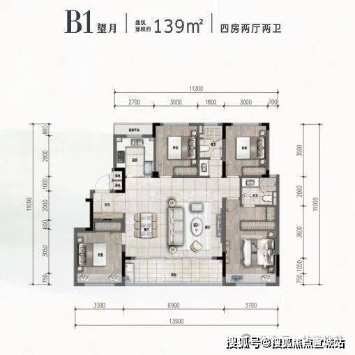 【B1望月户型】139m,4室2厅2卫,南、北朝向,户型价格【375/套】