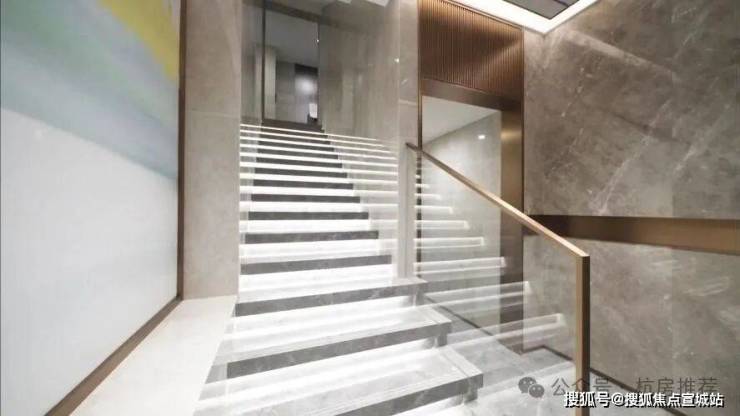 公共区域的楼梯台阶上还做了灯带设计,除了满足照明功能,整个公区的时尚感也让人眼前一亮。