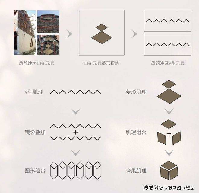永兴里从老城厢建筑中提炼出“菱形山花”作为超级符号,将其转化为门头雕花、地库导视甚至园林小品的视觉母题。