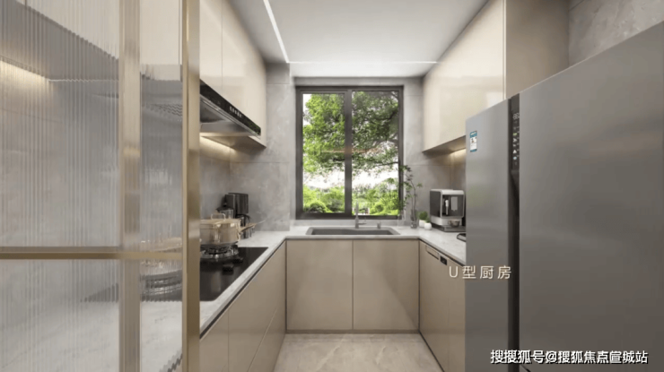 厨房U型操作台面,操作空间充裕;更值得点赞的是预留了双开门冰箱位置,你要知道普通百平米三房,基本只预留单体冰箱的空间。