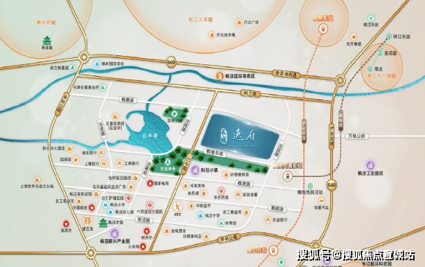 周边配套:项目南面约 500 米处有枫湾路菜市场及盒马超市,约 800 米处有肯德基、联华超市等。旁边在建五星级劲霸枫泾酒店。南面有枫泾幼儿园、枫泾小学、华师大附属枫泾中学等。约 800 米处有金山中西医结合医院,具有二级甲等资质。