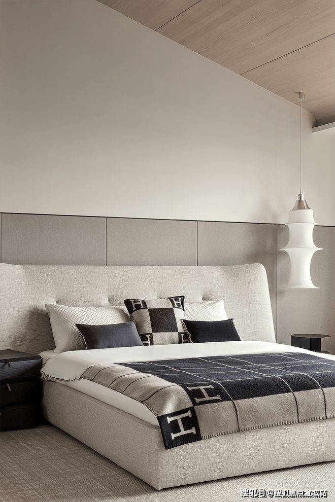 卧的斜形顶与整体空间相呼应,以质感深色作为主色调,营造出沉稳内敛的休憩氛围。