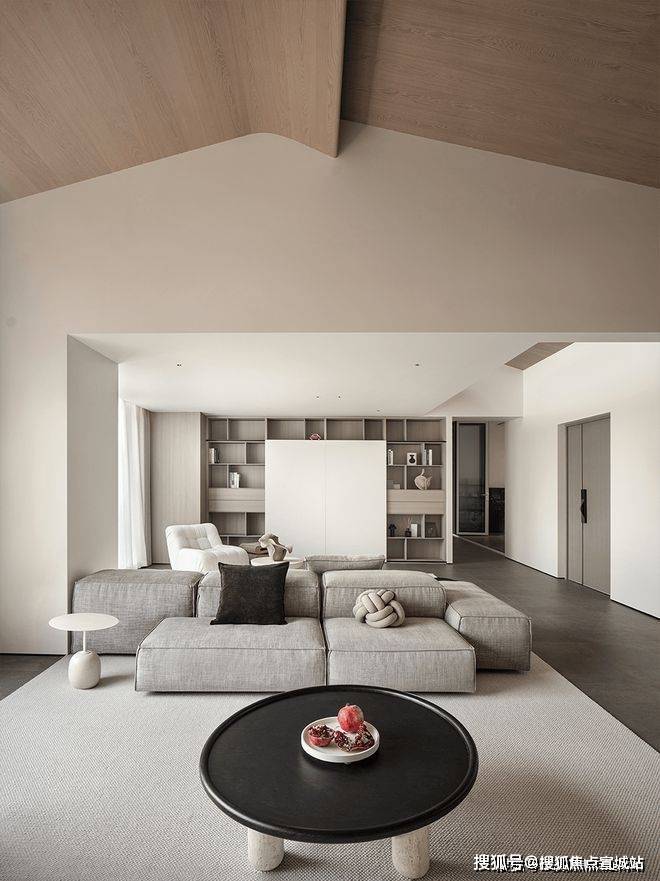 两面式沙发,打造出更随意的坐卧选择与舒适体验。木质吊顶铺展延伸,层次错落有致,仿若将室外的自然意境延伸到了屋内,简雅质朴而温润有加。