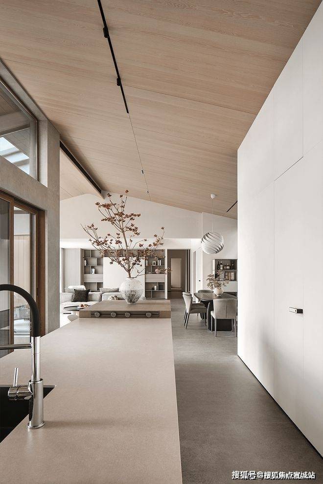 原有西厨空间背后距离室外的高层太近,设计师将其格局进行重新梳理,对其进行了退后处理,把餐厅打造成了一个独具造景关系的私密生态空间。
