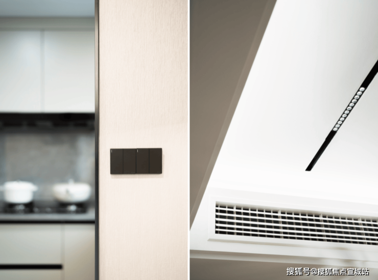 每一面墙是全屋墙布交付,且踢脚线采用的都是不锈钢设计。全屋还都采用了中央空调 、新风系统。