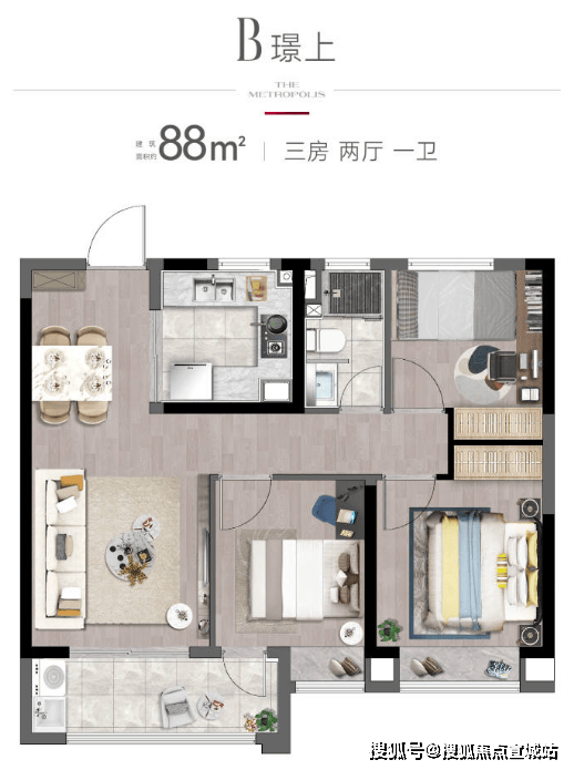 无论88㎡还是98㎡,主卧的北向,都有一个约2.4米开间的设置,不仅可以当书房使用,也可以根据家庭人口的需要设置成儿童房或者客卧。