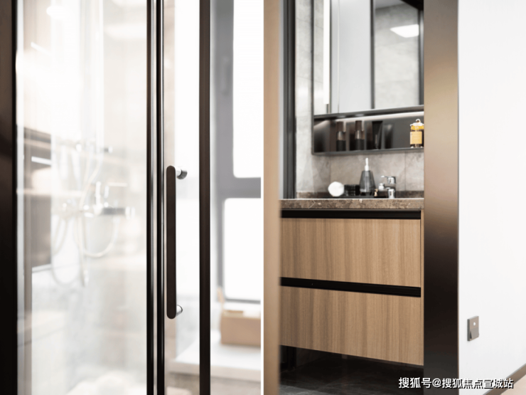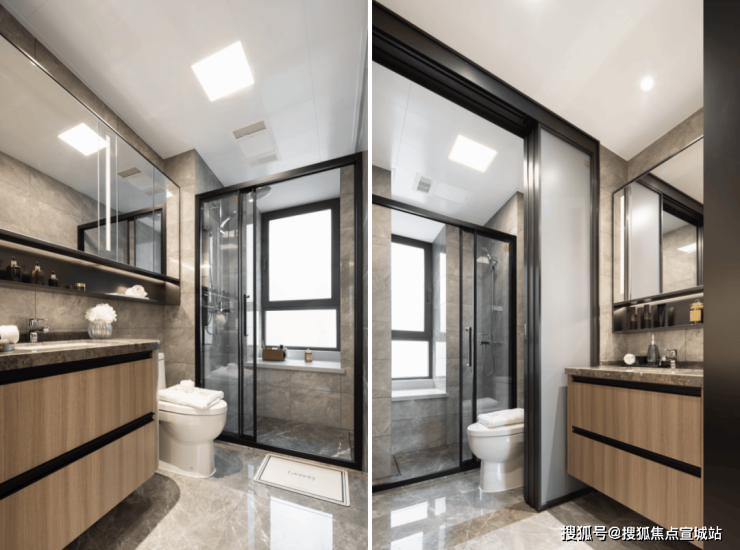 卫生间中,三分离的设计下,采用的是三联动轨道移门,两个移门价值上万块。门槛石、卫浴柜台面均为土耳其进口奥尔兰大理石材质,品质感和设计感都拉满了。