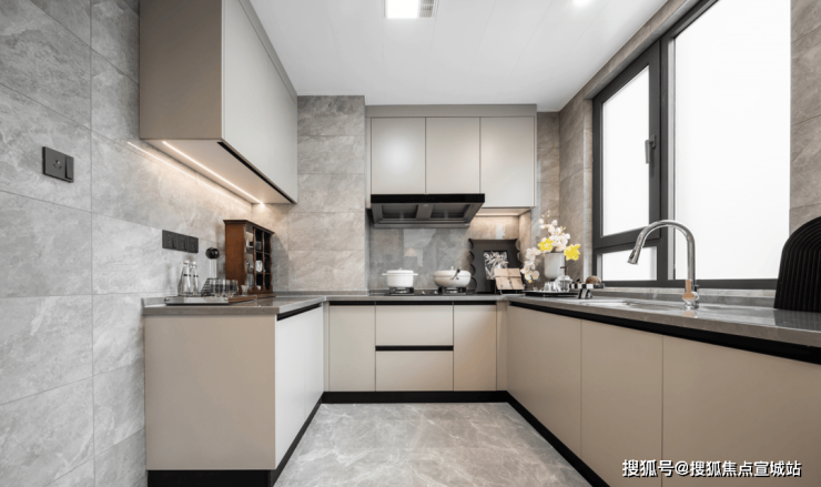 而台面是极具高级感的维多利亚灰人造石材质。大单台下盆、抽拉式水龙头,人性化设计理念彰显设计美学,厨房门是窄边金属玻璃移门,更具有质感。
