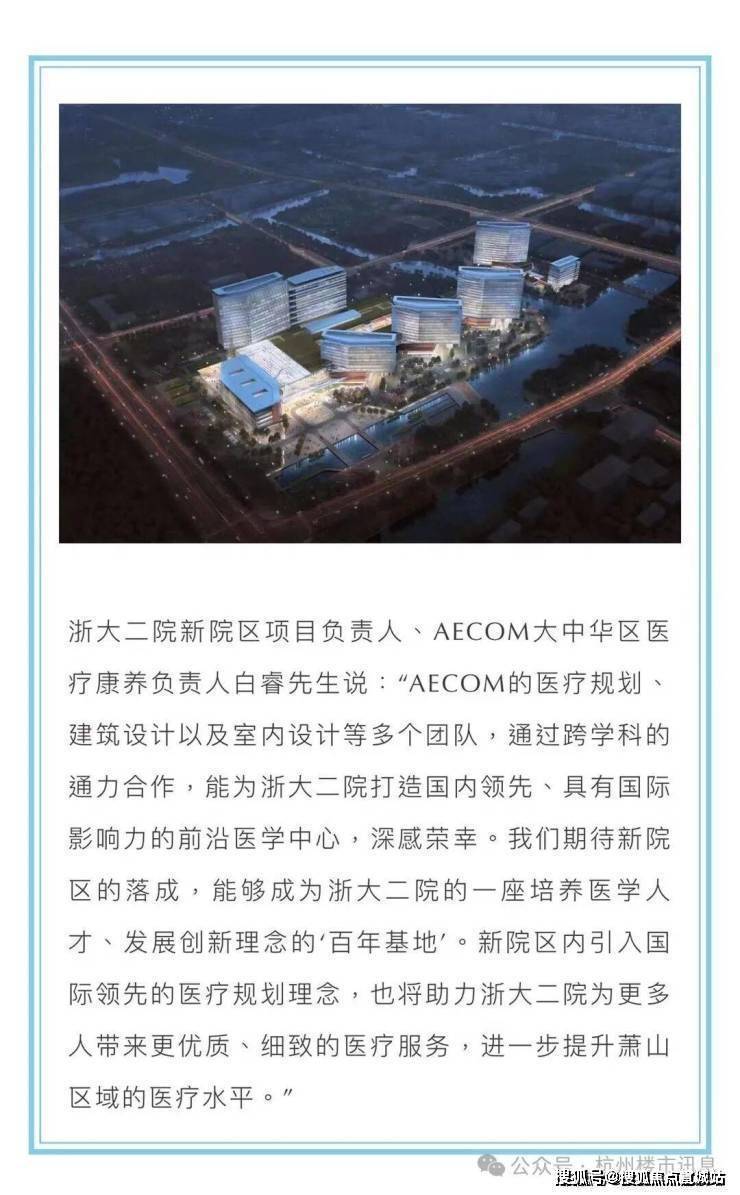 (规模是解放路老总部10多倍)距离项目约900米,占地500亩,规划2600张床位,规模比目前市中心的老浙二要大10倍,目前已经正式动工,是杭州最大的医院,全国顶尖的三级甲等医院!浙二医院的入驻将大大带动板块内其它配套的落地速度,加速了地铁1号线南延线与15号线的推进工作,不仅可以引进很多人才,同时也会带动南部新城经济的重大提升,预计将会在2026年完工