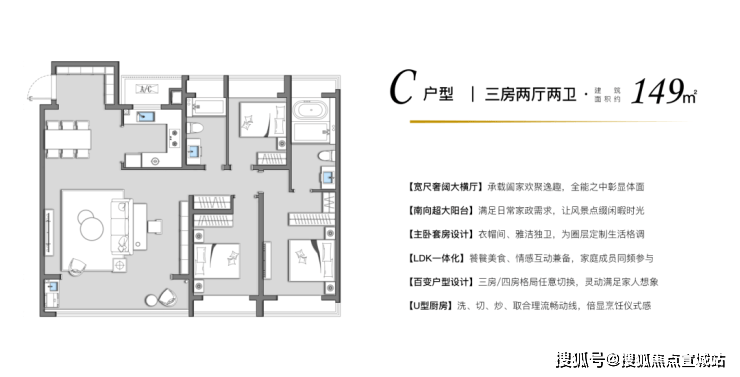 120-140㎡四房两厅两卫:改善型需求,双阳台设计,客厅开间达4.2米