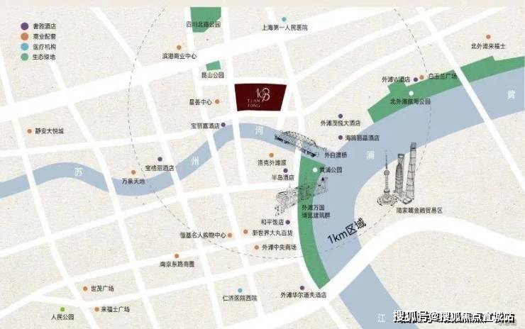 楼盘地址:上海市虹口区天潼路与乍浦路交汇处,地处黄浦江与苏州河交汇的 “钻石三角” 地带,与外白渡桥直线距离仅约 200 - 300 米。