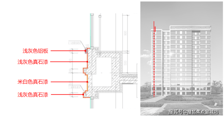 色彩提炼:米白色真石漆与浅灰色铝型材,抽象提取“粉墙黛瓦”的色彩关系。