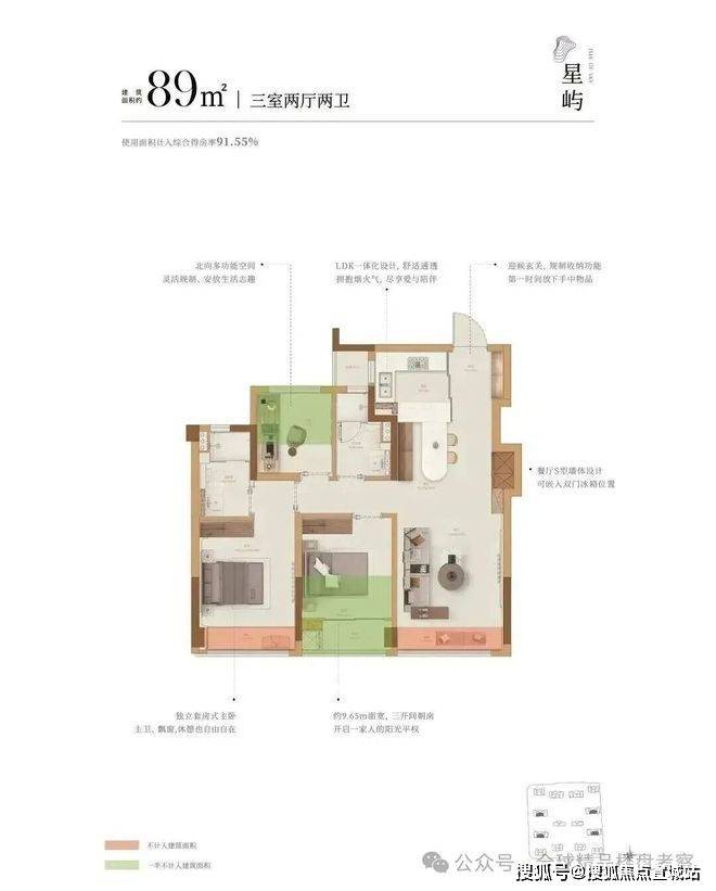 沐芳洲全盘建筑面积约89㎡-132㎡,通过阳台面积延伸、巧妙设置飘窗等手法,部分户型实际得房率可达约100%。
