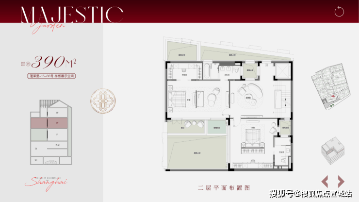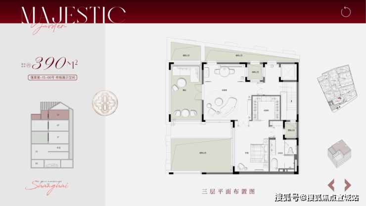合院地上三层,面积段约270-500㎡,计合院82套。