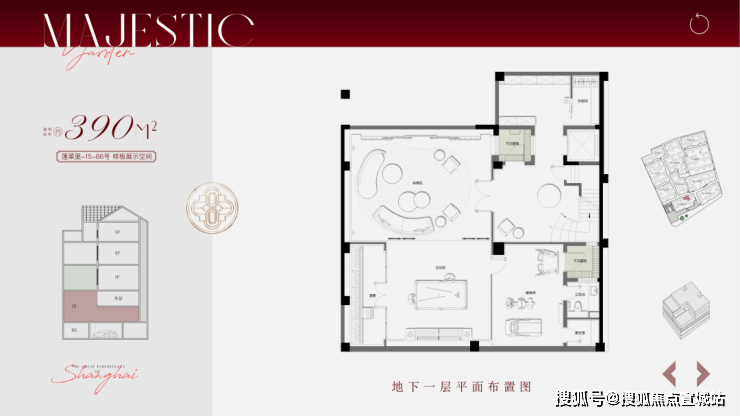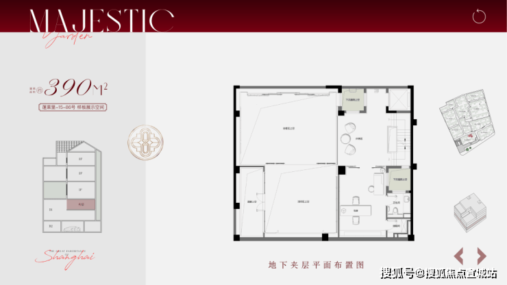 叠拼面积段约195-310㎡,分为1-2F下叠、3、4、5F为中间的平层面积236㎡,6-7F为上叠,计56套。