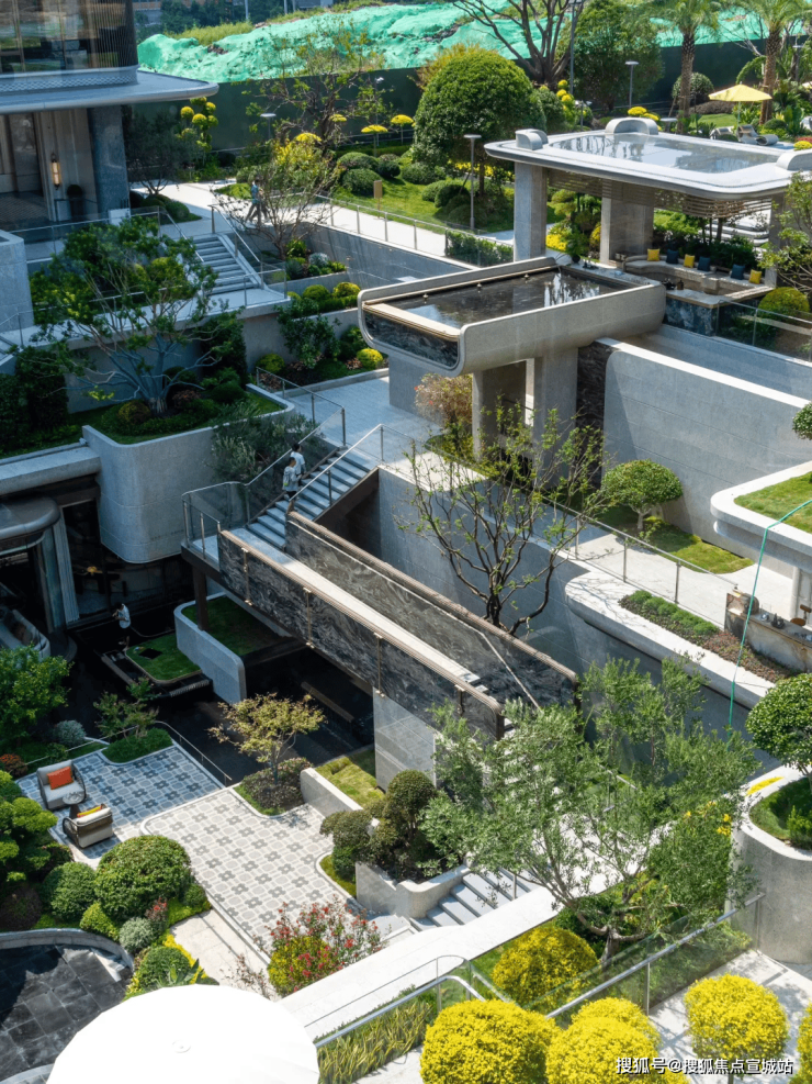 穿过大门,映入眼帘的是中轴下沉式庭院,咏舟府以“漂浮”为设计灵感,精心构筑了立体化、多层次的花园景观。瀑布、水景、植被与观景平台巧妙融合,打造出层次丰富的立体景观空间。未来感与艺术性在此交汇,营造出悬浮于自然之上的生活场景,成为新中心的标志性名片。