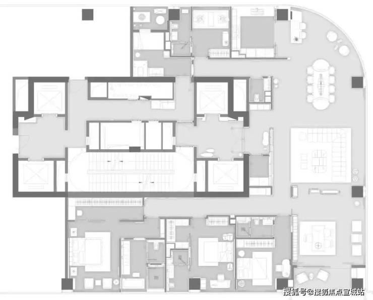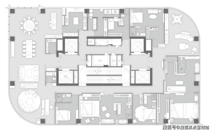 胤璞“荣耀”700方:户型由GFD广飞设计事务所创始人叶飞亲力打造。五间豪华套房与三大公共空间的布局,能够满足每一位家庭成员的个性化需求。双重入户动线与私属门厅玄关,尽显归家的尊崇礼序。
