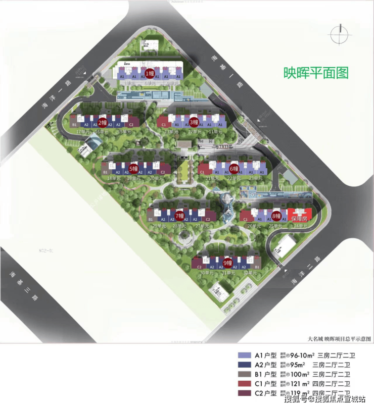 【大名城·映玥】此次推出主力户型为建面约84-96㎡(3房)的洋房,1梯2户私密设计,容积率低至约1.2,建筑密度约21.65%,车位配比1:1.1。