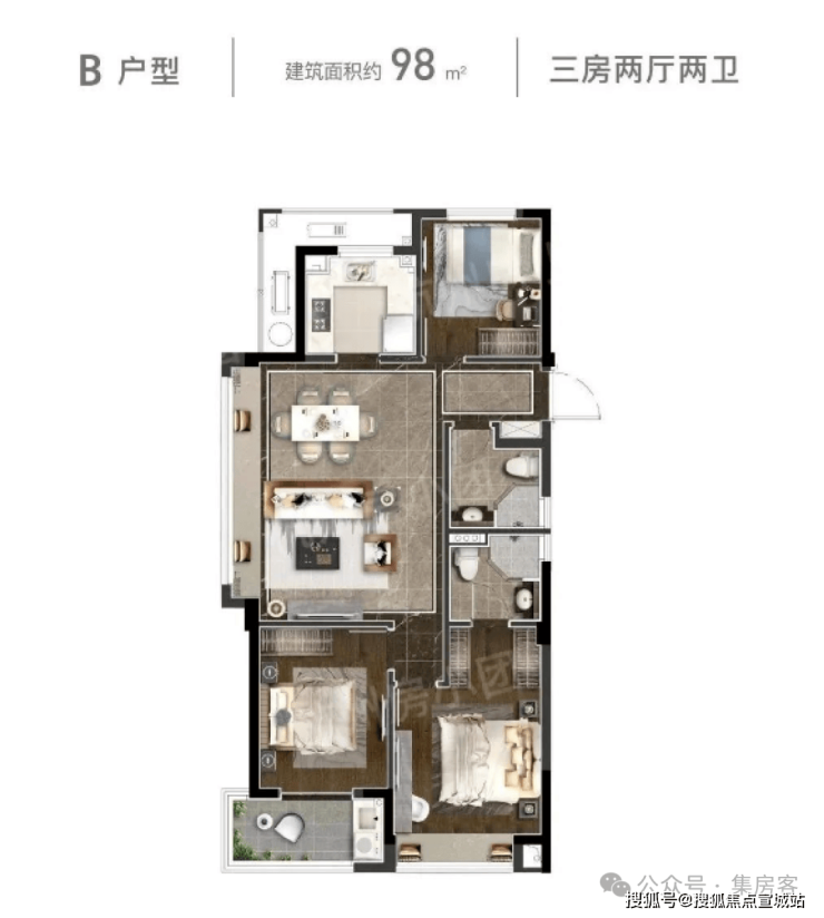 该户型为项目的中间套户型。三开间朝南,采光好!餐客厅一体带南向阳台,晾晒方便,主卧为套房设计带独立卫生间