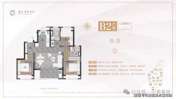 1、建面约100㎡三房两厅两卫,市场主流户型。客餐横厅设计配多功能阳台,优势在于更大采光面和更好通风效果,把过道纳入到客厅和餐厅的空间中来,使整体空间得到更好的利用。