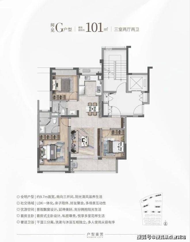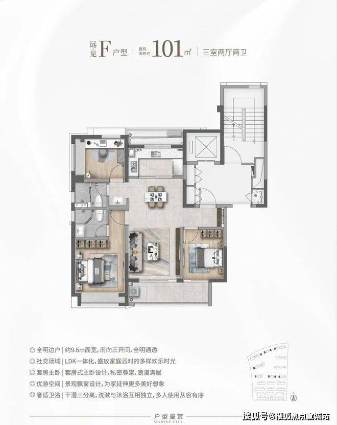 H户型:瞰·见建筑面积约101㎡,三房两厅两卫