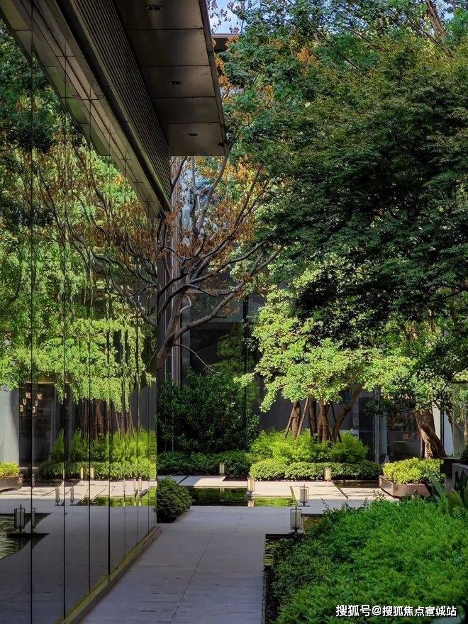 走进来,便是满眼绿意的下沉式景观庭院,拾级而上,两侧景观在阳光的照耀下呈现出非凡的光影,还有潺潺流水相伴,带来度假式的沉浸体验。