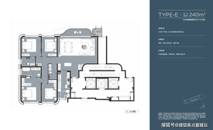 约240㎡4房产品,是典型的大面宽产品,临江面的面宽,可以达到超16米,超大面宽客厅结合弧形阳台,搭配着270°大面积宽幅全高玻璃窗,将整个滨江景观尽收眼底!