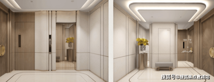 标准层电梯厅中,主厅地面均为石材,3D弧形墙面,吊顶曲线与地面呼应,以品质细节,进一步深化仪式感。