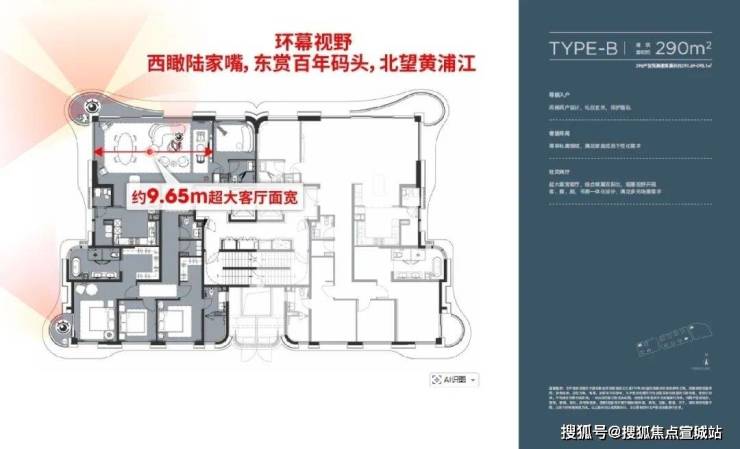 建面约290㎡户型,拥有约9.65米超大客厅面宽,搭配蝶翼双阳台,西瞰陆家嘴摩天天际,东赏百年码头人文底蕴,北望黄浦江浩渺江景,环幕视野拉满。